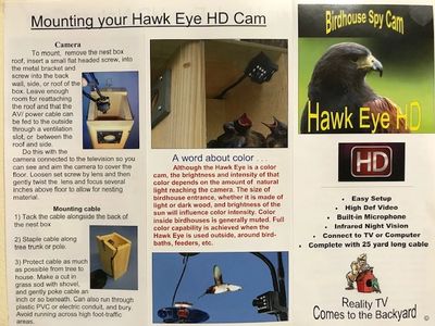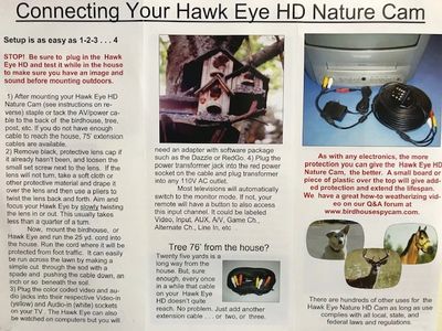 The setup for Birdhouse Spy Cam video cams really couldn't be easier. Simply hang the birdhouse, or attach the Hawk Eye to a post overlooking a feeder; run the cable into the house, plug the audio and video plugs into the appropriate RCA jacks (video-in and audio-in) in the back of the TV. Plug in the power, switch to the correct television input, and then sit back and enjoy.